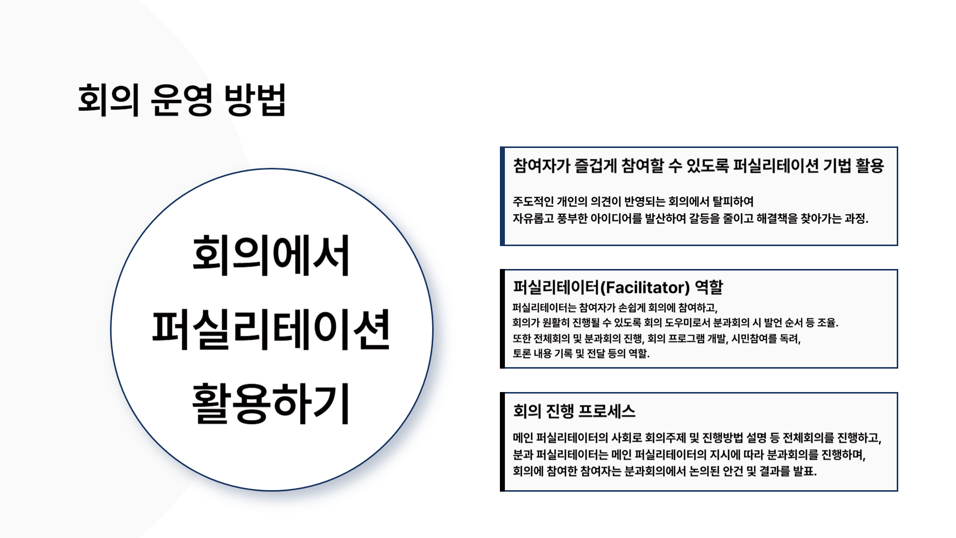 퍼실리테이션이란, '원활한 의사소통과 협력 도모를 위한 중재 과정' 을 뜻하는데요,