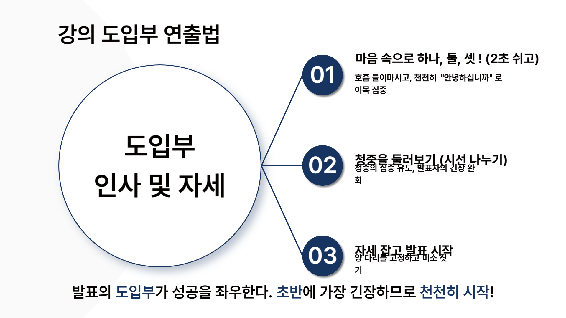 다음으로는 비언어적 요소(인사, 자세 등)를 통해, 도입부에서 청중의 관심을 사로잡는 연출법을 배워보았습니다.